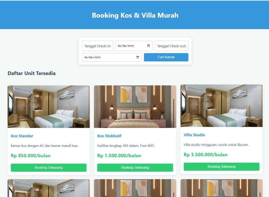 Tampilan profesional: Bisa langsung pilih villa, atau mobil untuk di booking berdasarkan Tgl dan bulan.